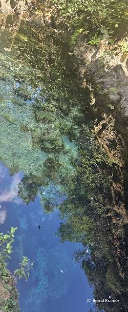 Ein kleiner Sprung führt uns zur Sorgente Gologone. Wir sitzen nebeneinander am Wasser, sie taucht die Hände hinein und füllt eine Flasche mit dem heiligen Wasser der Quelle . Wit taufen unseren Motorroller auf Black Hornet . Ein Moment, der bleibt.