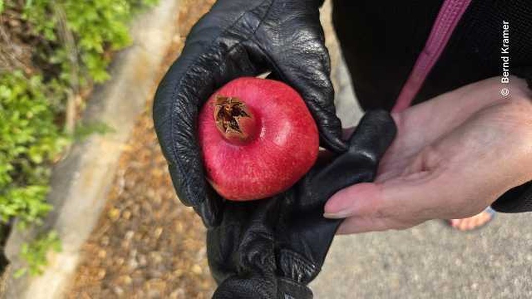 Am Straßenrand leuchten reife Granatäpfel in der Sonne, ihre roten Schalen platzen fast vor Saft. Ich steige ab, pflücke vorsichtig ein paar Früchte und genieße den süß-