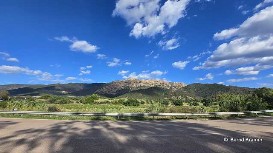 Die Berge erheben sich majestätisch, ihre Flanken teils karg, teils bewachsen mit dichten Steineichenwäldern. In ihrem Schatten wirkt die Hitze gedämpft, das Licht gebrochen in tausend Grüntönen. Hin und wieder öffnet sich der Wald, und der Blick fällt weit hinunter ins Tal, wo Felder, Weiden und kleine Gehöfte liegen.
